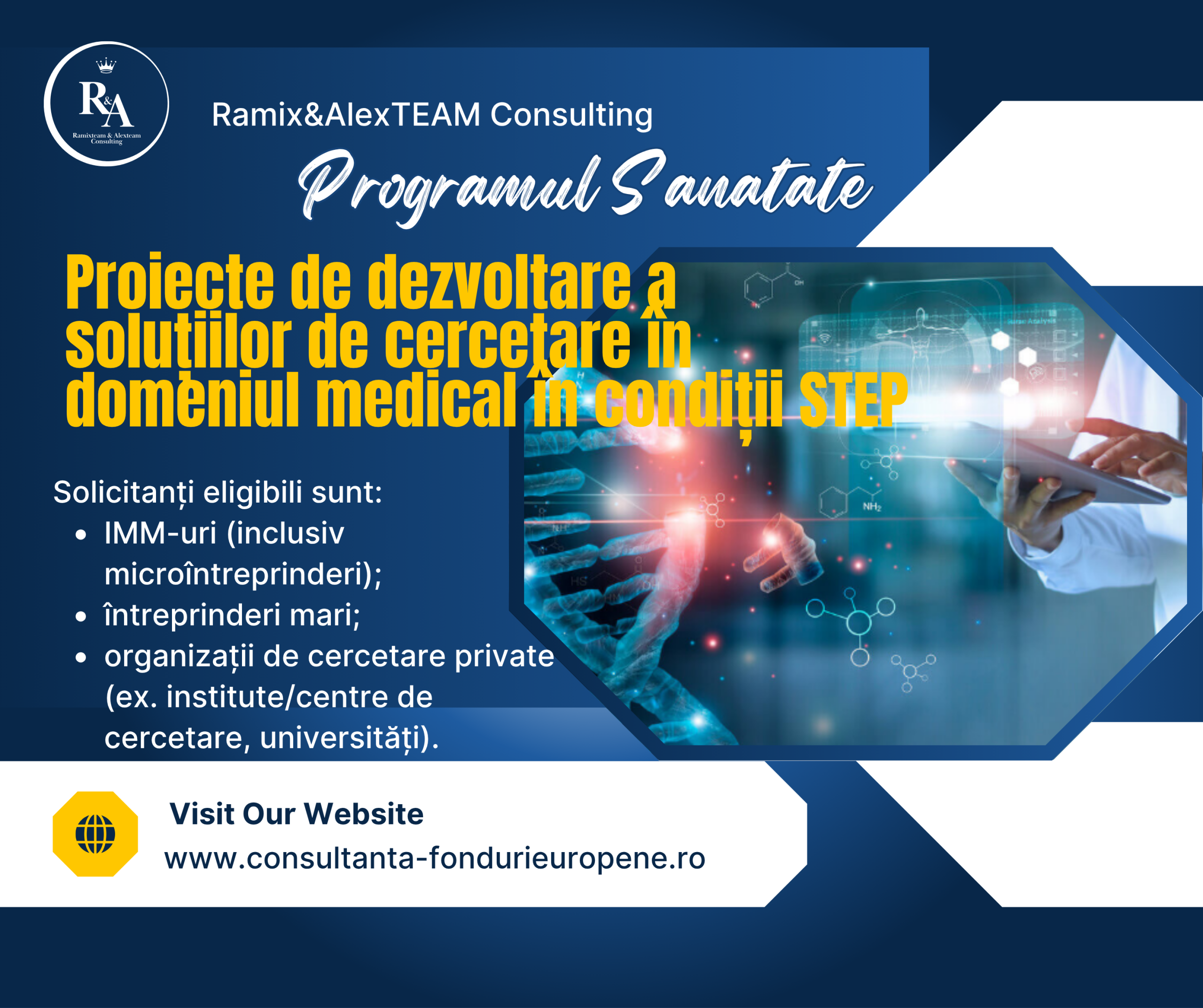 Autoritatea de Management pentru Programul Sănătate a lansat astăzi, 30 iulie 2025, apelul de proiecte „Sprijinirea proiectelor de dezvoltare a soluțiilor de cercetare cu aplicabilitate în domeniul medical în condiții STEP în sectorul biotehnologiilor, tehnologiilor digitale și inovației tehnologice profunde”, din cadrul Priorității 9 „Contribuția la Platforma STEP: biotehnologii și tehnologii digitale, inclusiv servicii asociate în sectorul sănătății”, Fond FEDR, Acțiunea B, Obiectivul de politică 1, Obiectivul specific RSO1.6., Acțiunea B.