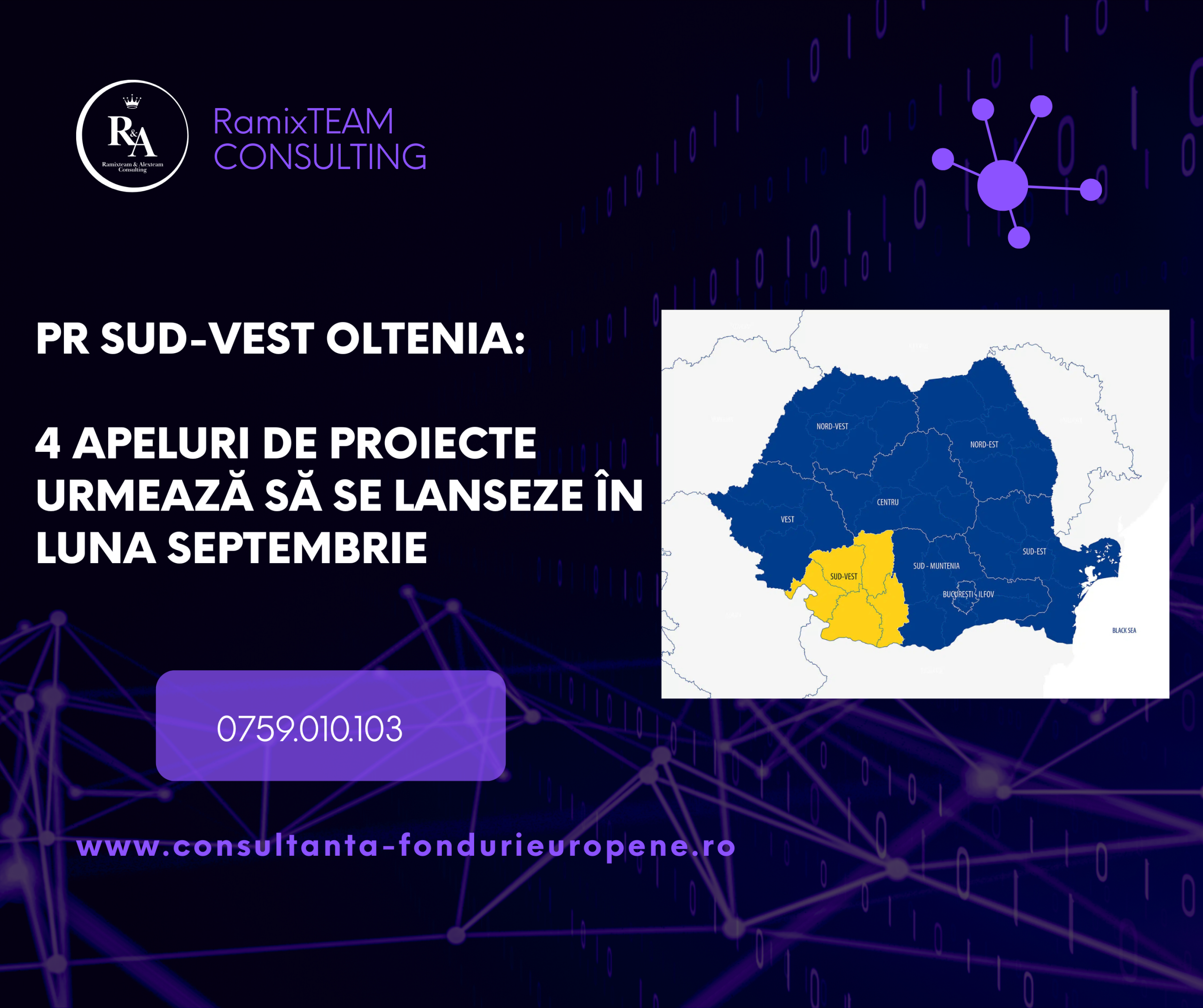 Agenția pentru Dezvoltare Regională Sud-Vest Oltenia, în calitate de Autoritate de Management pentru Programul Regional Sud-Vest Oltenia 2021-2027, a anunțat joi, 7 august 2025, lansarea a 4 apeluri de proiecte în luna septembrie.
