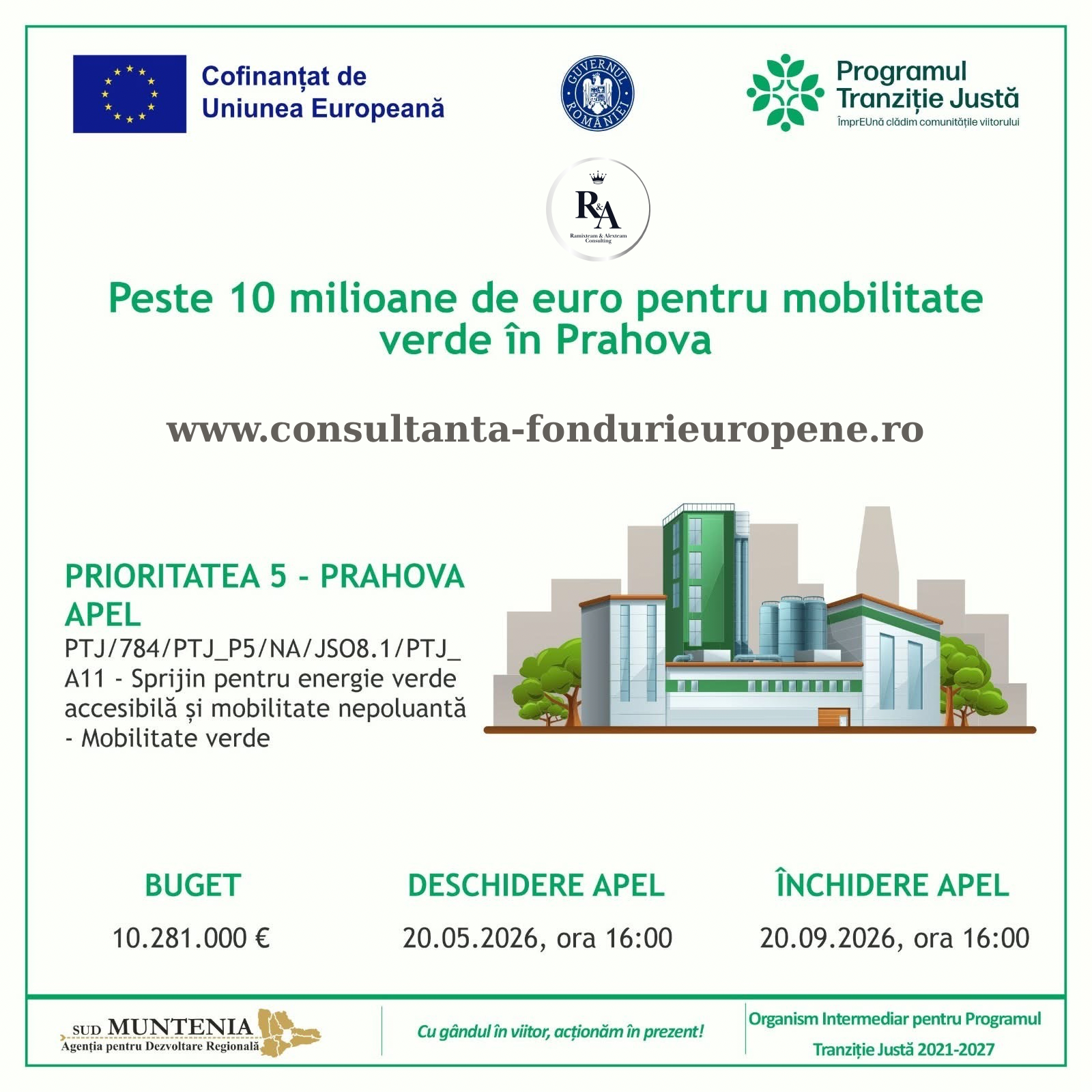 Agenția pentru Dezvoltare Regională Sud-Muntenia, în calitate de Organism Intermediar pentru Programul Tranziție Justă 2021–2027, gestionează aceste fonduri europene nerambursabile dedicate companiilor și administrațiilor publice locale din județul Prahova, sprijinind tranziția către o economie verde.